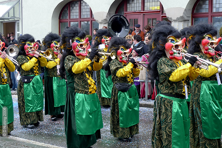 Apart from joining in parades at various Swiss cities (in this photo, Frauenfeld in the canton Thurgau) at the 'Fasnacht' time of year, they play at other times of the year for company events, weddings, festivals and birthday celebrations.